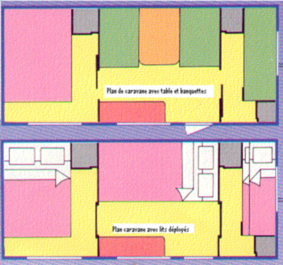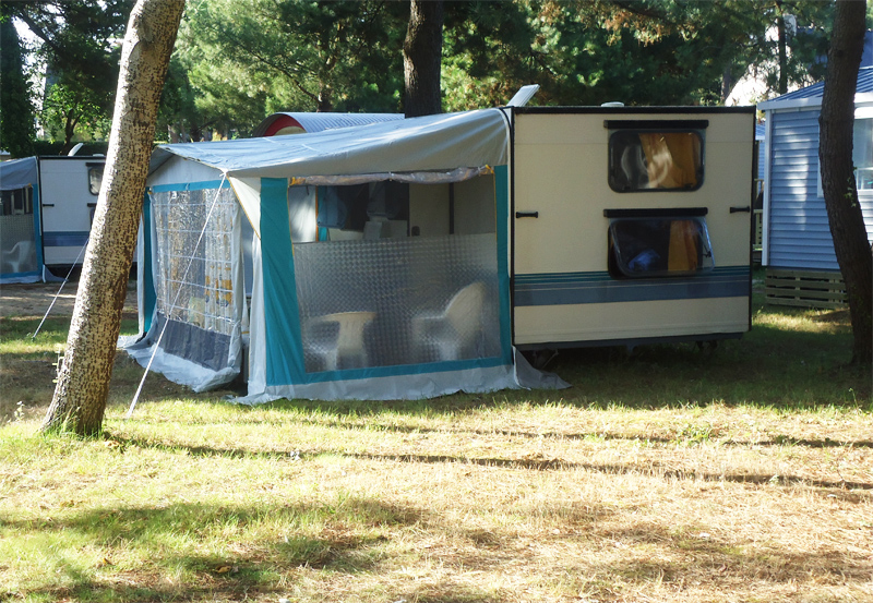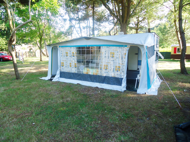 Les caravanes ADRIA d'une capacité de 6 couchages en 3 pièces séparées, vous sont proposées avec un grand auvent.