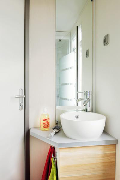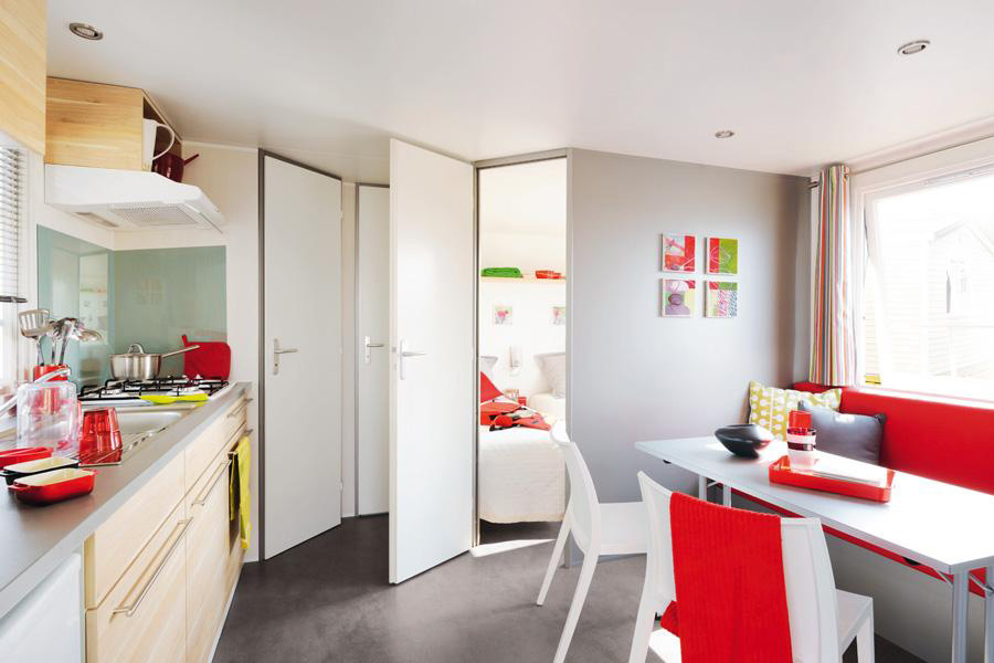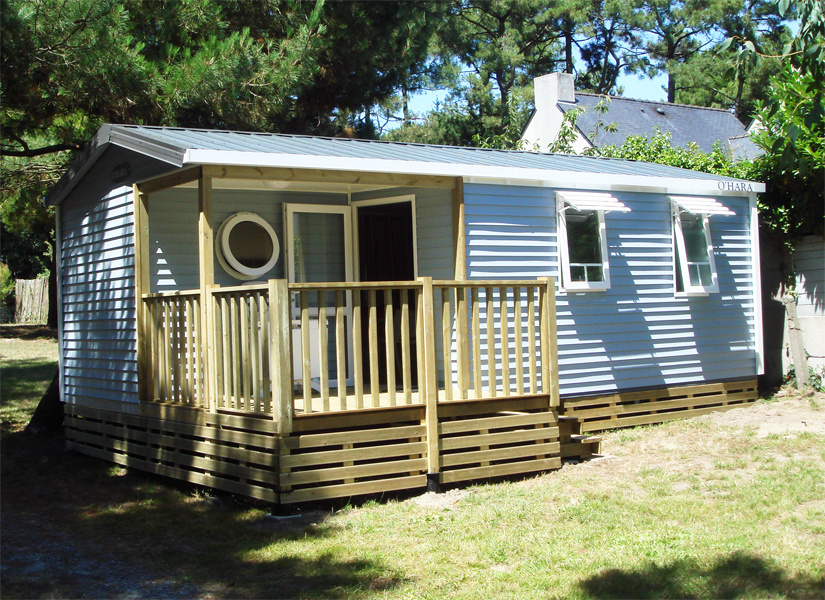 Le mobile O’HARA 2 chambres, vous est proposé avec une terrasse intégrée semi-couverte en accès direct de la cuisine labo intérieure.
